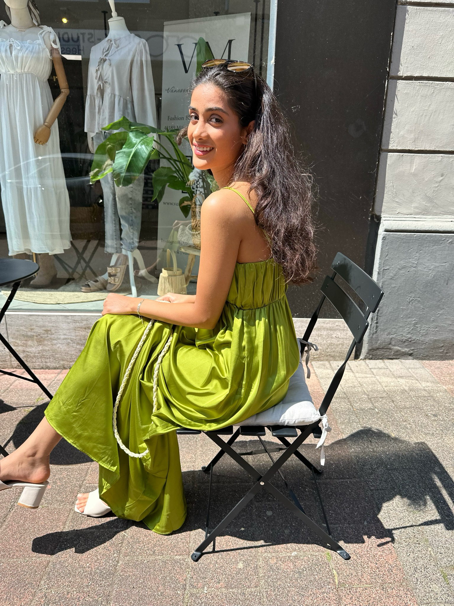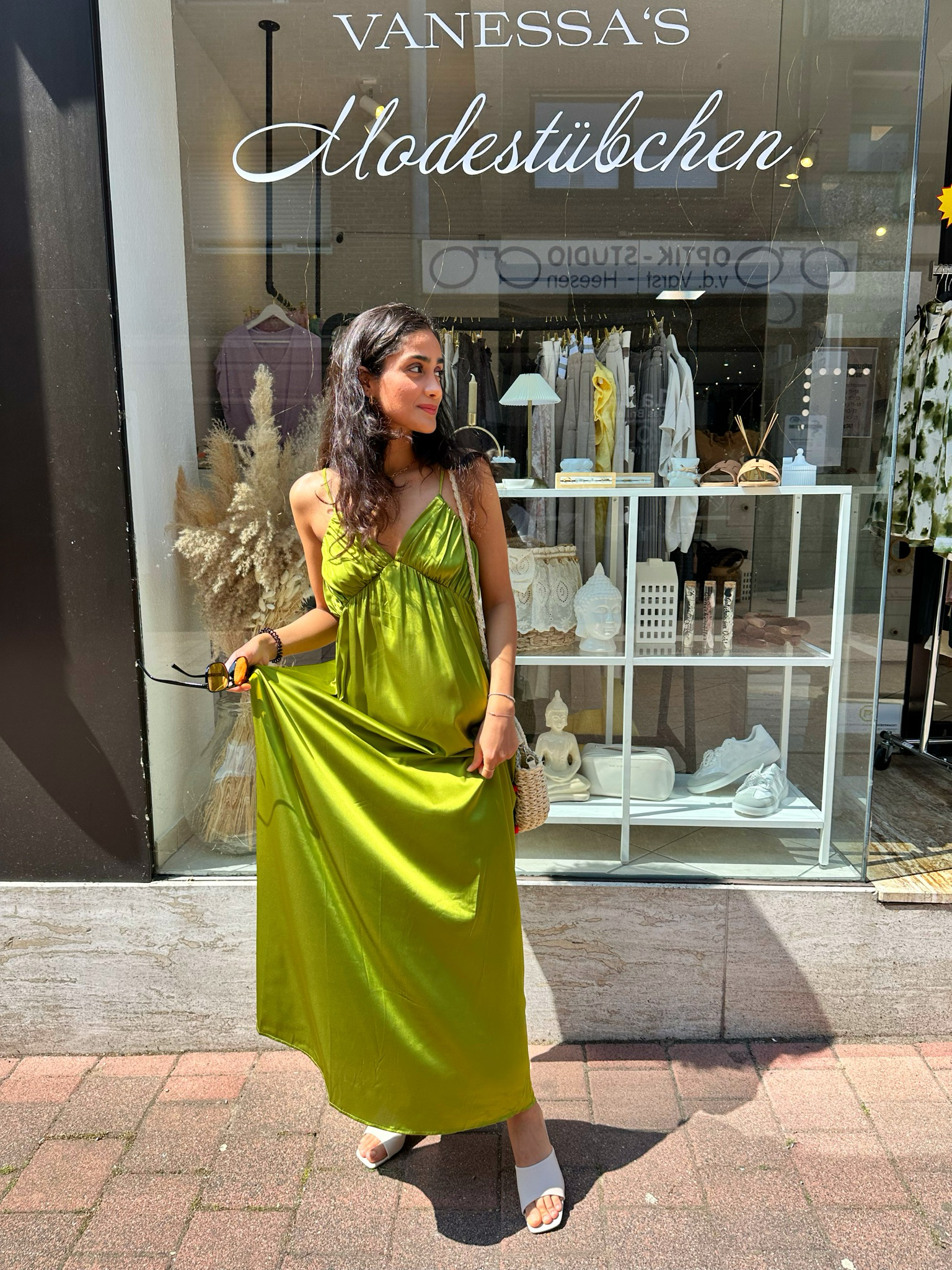 Dieses grüne Kleid in edler Satinoptik verfügt über einen dezenten Reißverschluss auf der Rückseite, der einen komfortablen Einstieg garantiert und die elegante Silhouette unterstreicht. Der hochwertige Stoff sorgt für einen geschmeidigen Fall und verleiht dem Look eine raffinierte Note, ideal für besondere Anlässe oder stilvolle Auftritte.